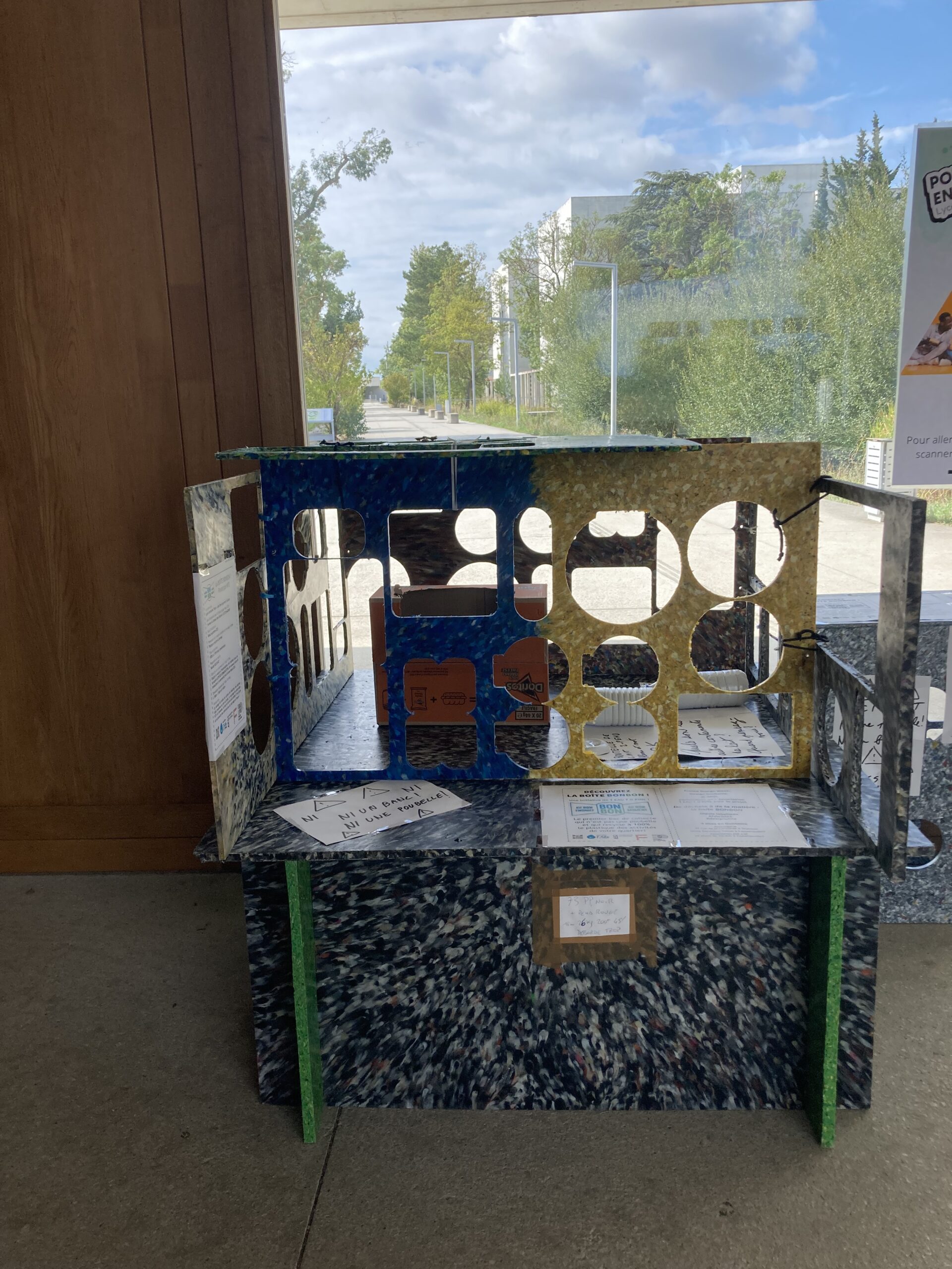 La BBB n°2 est installée depuis le 8 septembre dans le hall d’accueil du Lycée Germaine Tillion à Castelnaudary 1 (cf. annonce #fdw2025 #occitanie). Nous permettant de faire un lien entre WATE&HOPE et ALTER EGO COMMUNICATION, elle est une création d’opportunité pour introduire la notion d’écoconception dans la fabrication industrielle de la Boite BONBON dont le prototype retenu à ce jour correspond aux BBB n3 et 4. Il est possible de produire autrement 100% à base de recyclé ou de réemploi de manière à réduire ce commenatire juste : LA PRODUCTION SOURCE DE NOTRE POLLUTUON.
