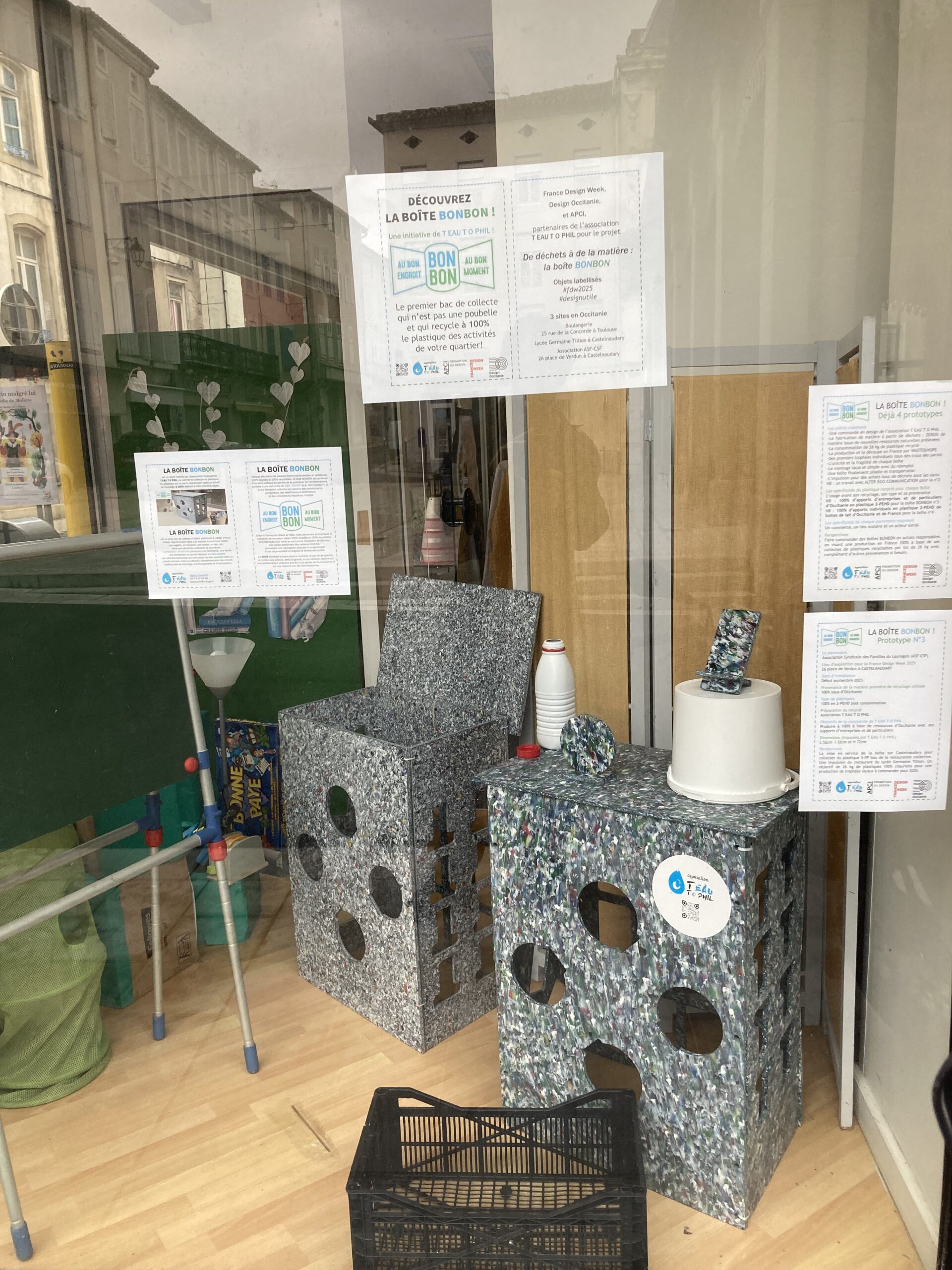 Installé durant la France Design Week 2025 au 26 place de Verdun à Castelnaudary,la Boîte BONBON n3 a pour vocation une mise en service à compter de novembre au self du lycée Germaine Tillion. Dans l’immédiat, c’est un support de DESIGN UTILE pour impulser des ventes, un lieu de retrait d’achats auprès de Waste&Hope en Occitanie et 2 premières collectes très homogènes et qualitatives de plastiques chauriens, audois et occitan.